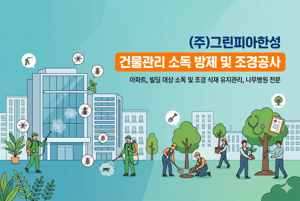 (주)그린피아한성은 아파트·오피스텔·상업빌딩 대상 소독방제용역, 해충방제 소독, 조경식재 공사, 조경 유지관리, 나무병원 수목진단을 전문으로하는 업체입니다.