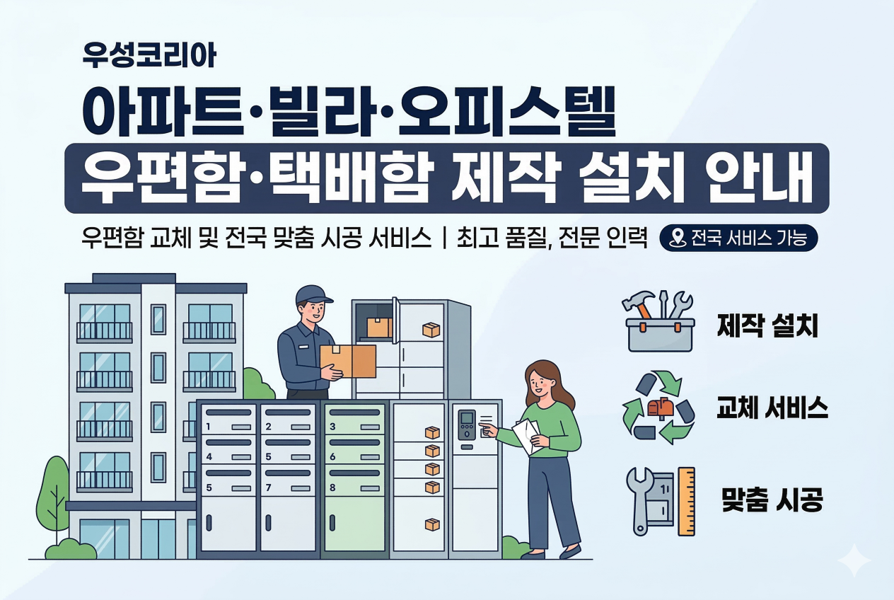 우성코리아는 아파트·빌라·오피스텔 우편함·택배함 제작 설치와 우편함 교체, 맞춤 시공 서비스를 제공하는 전문 업체입니다. 최신 디자인과 견고한 소재를 사용하여 직접제조합니다.