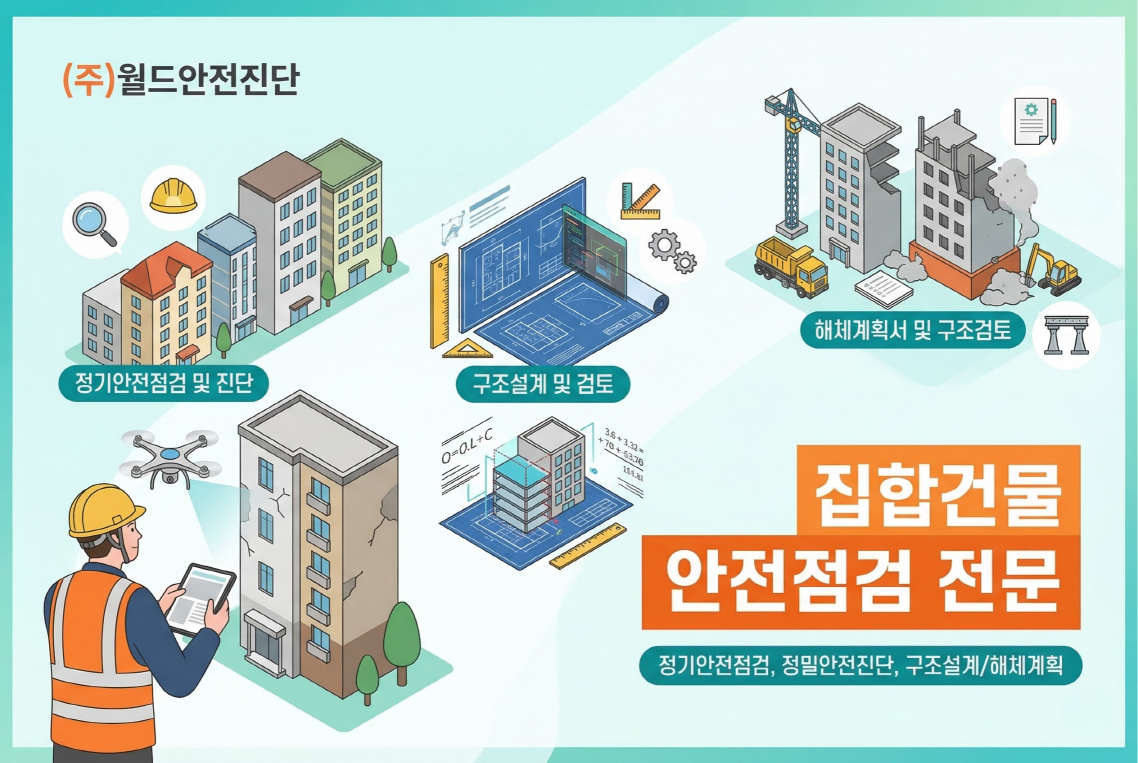 (주)월드안전진단은 집합건물 대상 정기안전점검, 정밀안전진단, 구조설계·구조검토, 해체공사 구조검토 및 보수·보강안 제시, 해체계획서 작성을 전문으로 하는 기업입니다.