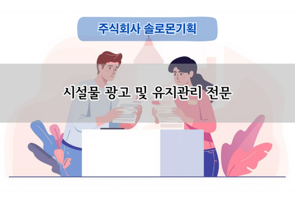 주식회사 솔로몬기획은 시설물 광고와 유지관리를 전문으로 하는 업체입니다. 최신 광고 기술과 디자인을 통해 효과적인 광고 솔루션을 제공합니다. 정기적인 유지보수와 관리를 통해 광고물의 상태를 최적화하며, 고객의 요구에 맞춘 맞춤형 광고 솔루션을 제공합니다. 다양한 환경에서 시설물 광고 및 유지관리 서비스를 제공하여 효과적인 홍보와 관리 성과를 보장합니다.